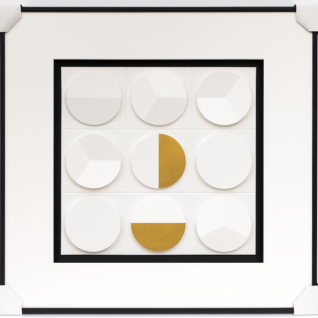 La composition centrale est constituée d’une grille de 3 x 3 cases, chacune contenant un disque en relief de couleur blanche. Ces disques ont des formes légèrement facettées ou planes, ce qui crée des jeux subtils d’ombres et de lumière selon l’angle de vue.
