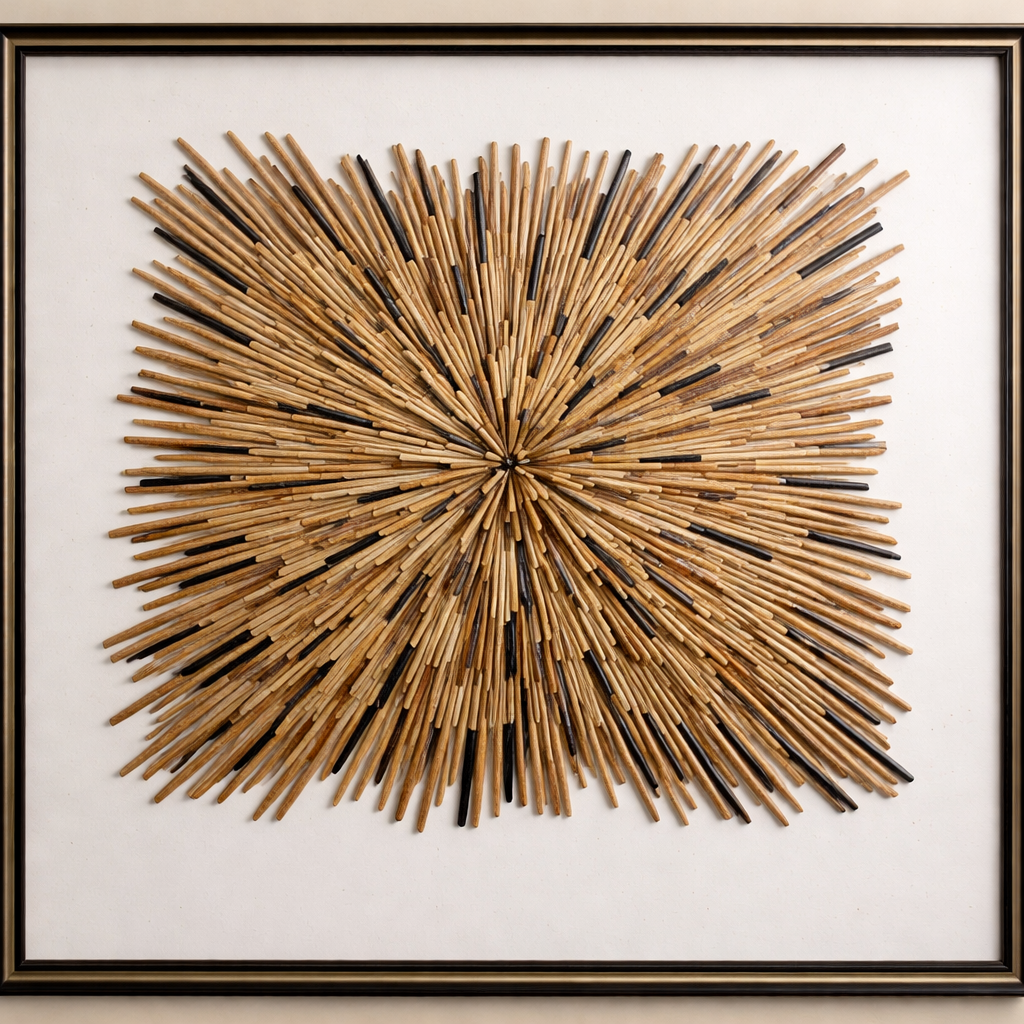 Ce tableau se distingue par un design artistique spectaculaire, inspiré d’un motif soleil en relief. La composition centrale est formée de tiges fines disposées en rayonnement, créant un effet dynamique et profond qui capte immédiatement le regard. Les nuances bois naturel, associées à des touches foncées et métalliques, apportent chaleur, contraste et sophistication.