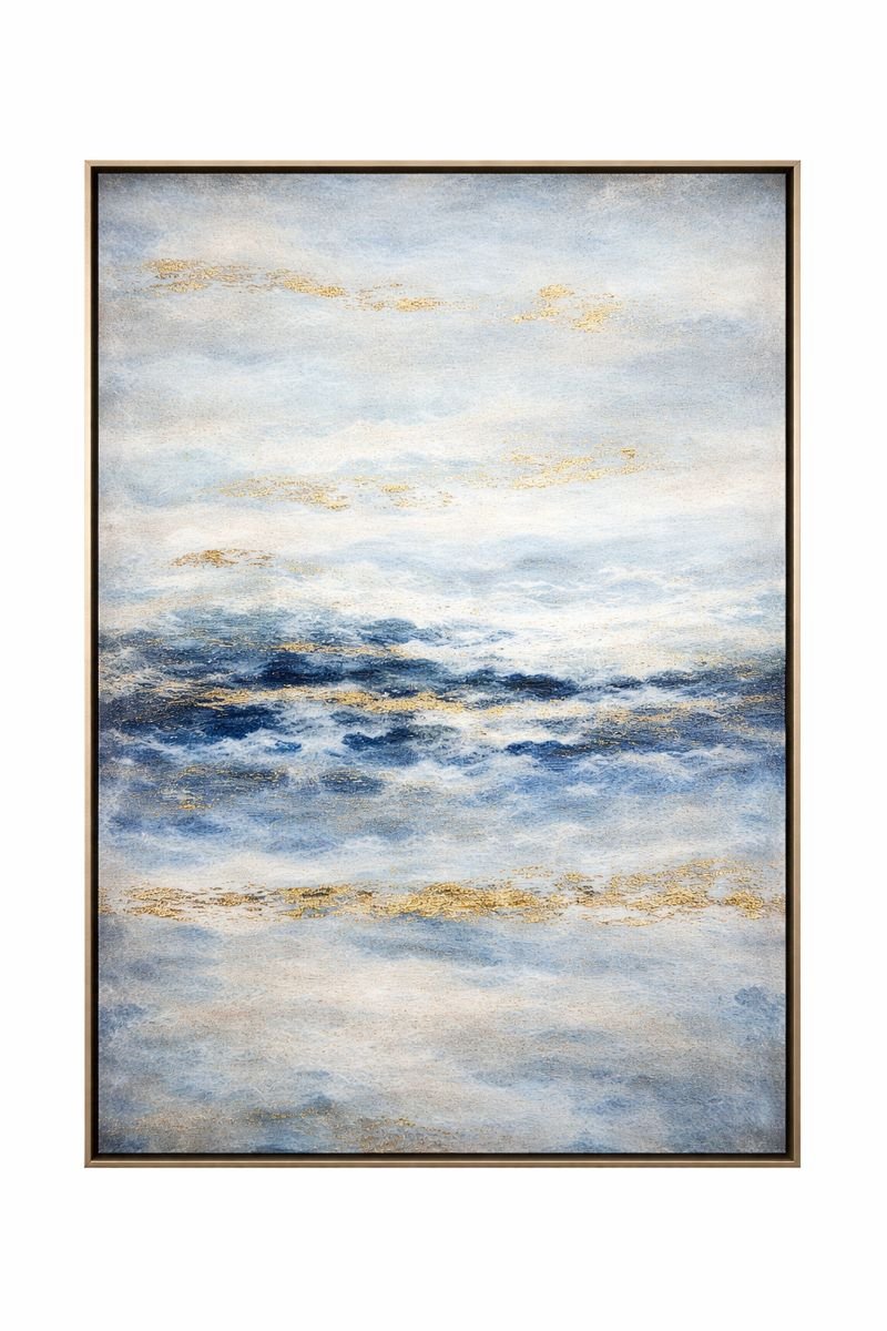 Des touches de doré, subtilement intégrées dans la matière, rappellent des reflets de lumière sur l’eau ou du sable scintillant. Ces accents métallisés ajoutent une dimension luxueuse et raffinée à l’ensemble, sans rompre l’harmonie visuelle.
