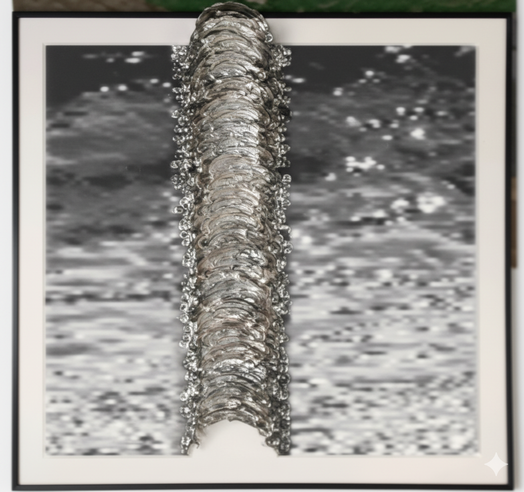 • Au centre, une colonne étroite et élancée descend de haut en bas, formée de fils ou de traits superposés et entremêlés, évoquant des cordages ou des filaments métalliques brillants. Leur répétition crée un effet de texture et de profondeur, presque sculptural.