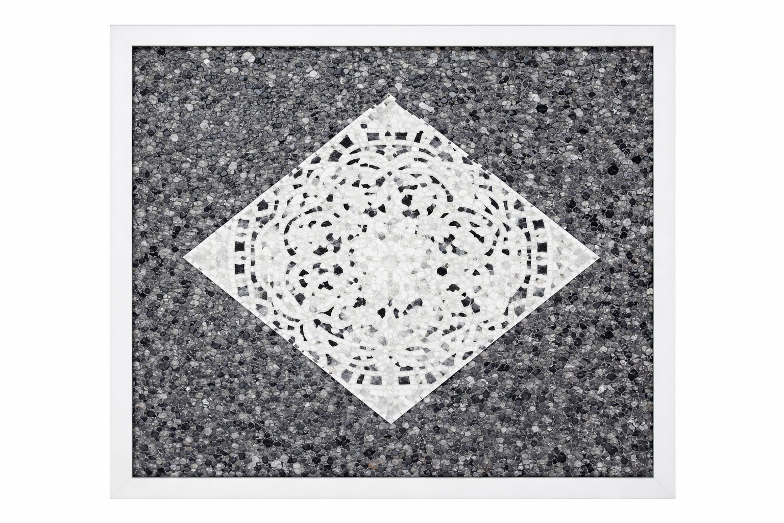 • Fond : composé d’un effet terrazzo ou mosaïque en tons gris, noir et blanc, apportant texture et profondeur.