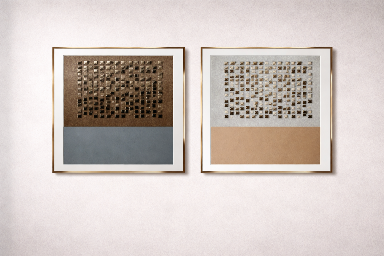 La partie supérieure de chaque tableau présente un motif géométrique en relief, composé de petits éléments métalliques disposés avec précision, créant un jeu de lumière et de profondeur subtil. Les finitions métalliques aux nuances bronze, champagne et argent confèrent un aspect haut de gamme et artistique.