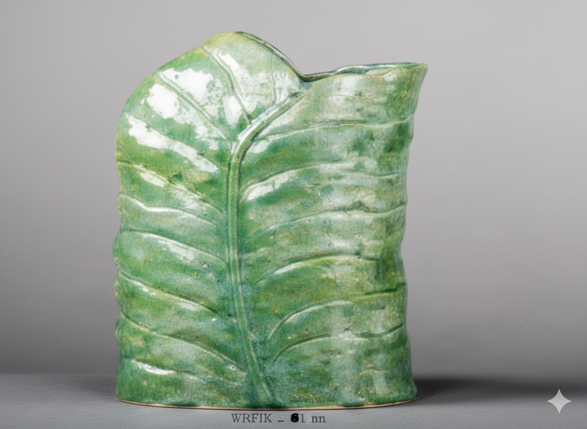 Ce vase est unique, sculpté pour ressembler à une grande feuille nervurée, avec des teintes de vert évoquant la nature. Il a une texture marquée et une forme irrégulière qui lui donne un aspect organique et artisanal. La partie supérieure est ouverte, suggérant qu’il pourrait accueillir quelques fleurs ou être une pièce décorative à part entière.