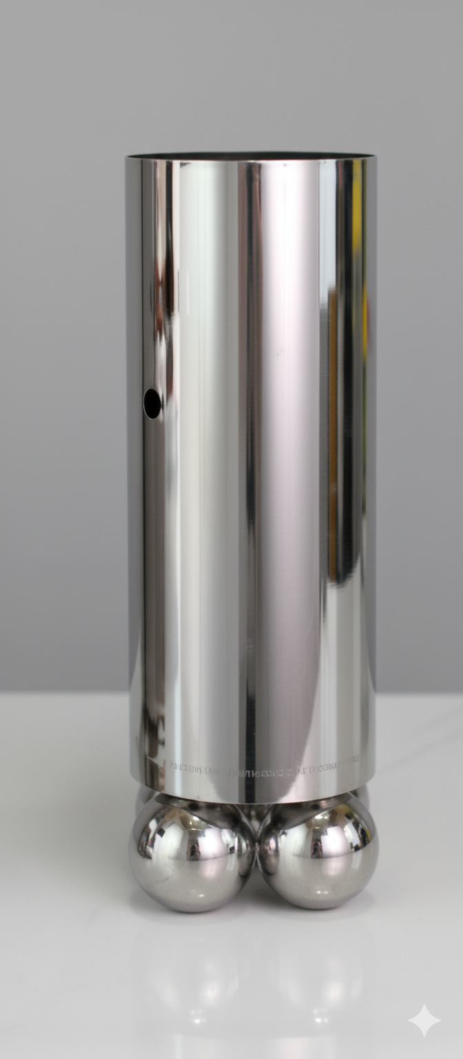 Sa base composée de trois sphères métalliques apporte stabilité et originalité, créant un contraste harmonieux entre les lignes droites du cylindre et les formes arrondies du socle.