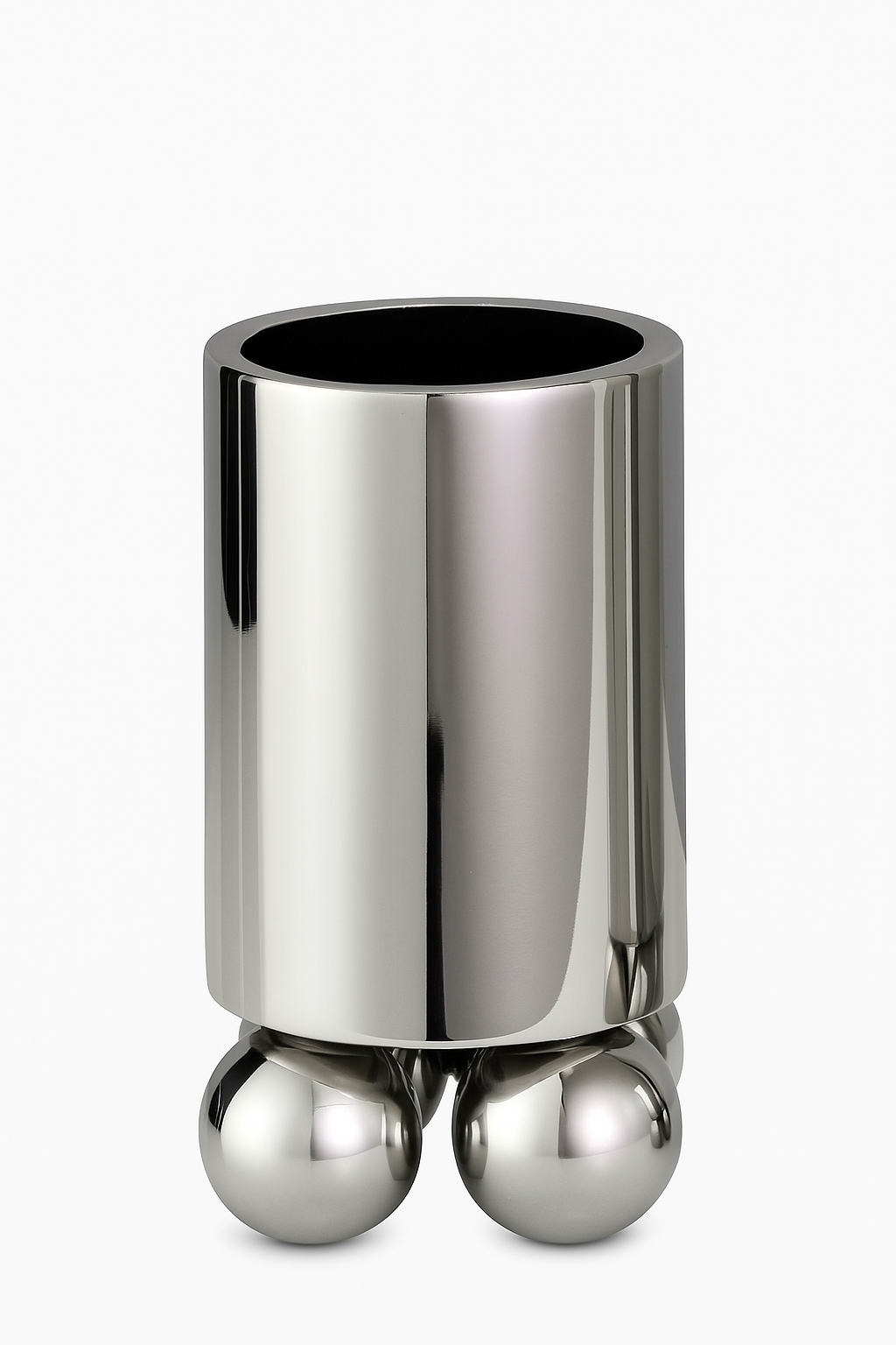 Ce vase PM présente un design moderne et minimaliste. Il est de forme cylindrique, entièrement recouvert d’un fini métallique argenté brillant qui lui donne un aspect élégant et contemporain. La particularité de ce modèle réside dans sa base composée de trois sphères métalliques lisses, servant de support décoratif et original.