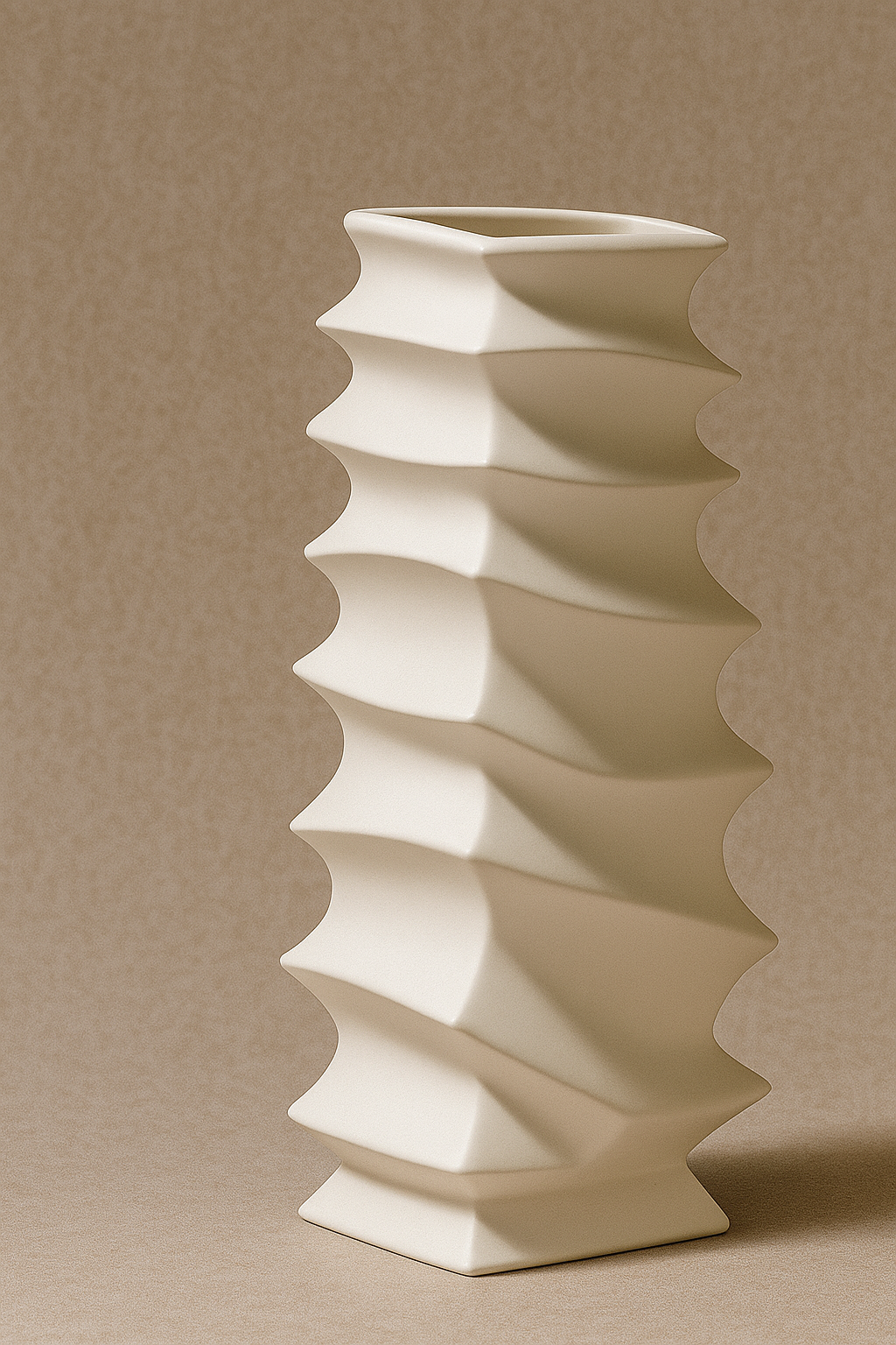 Ce vase présente un design moderne et sculptural. Il est en céramique blanche, avec une forme rectangulaire et un corps composé de plusieurs sections superposées aux contours anguleux et ondulés. Chaque niveau semble légèrement décalé, créant un effet visuel de mouvement et de texture. Sa surface lisse et mate renforce son aspect élégant et minimaliste. Ce vase de format moyen (PM) serait parfait comme élément décoratif sur une étagère ou une table, apportant une touche artistique et contemporaine à un intérieur.