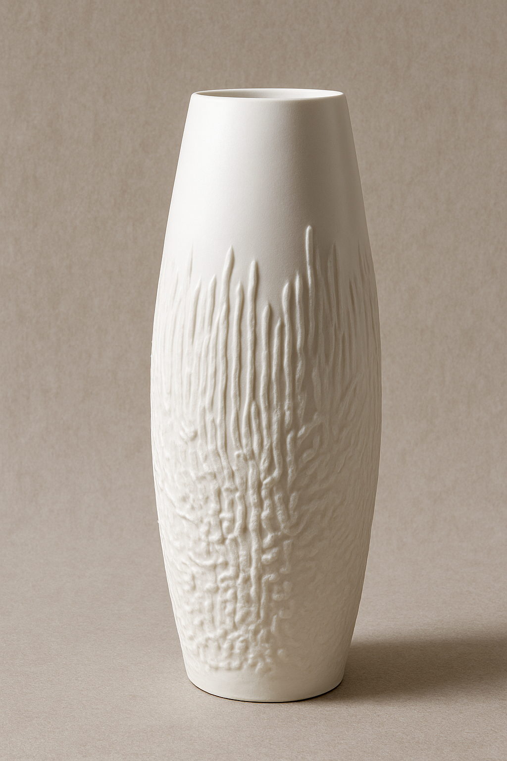 Ce vase est de couleur blanc mat, avec une forme élancée et cylindrique légèrement évasée vers le haut.