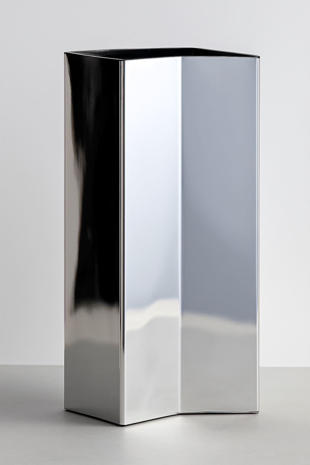 Sa surface est lisse et réfléchissante, rappelant un effet miroir métallique. Cette finition brillante lui donne un aspect sophistiqué et contemporain, capable de capter et refléter la lumière de manière élégante.