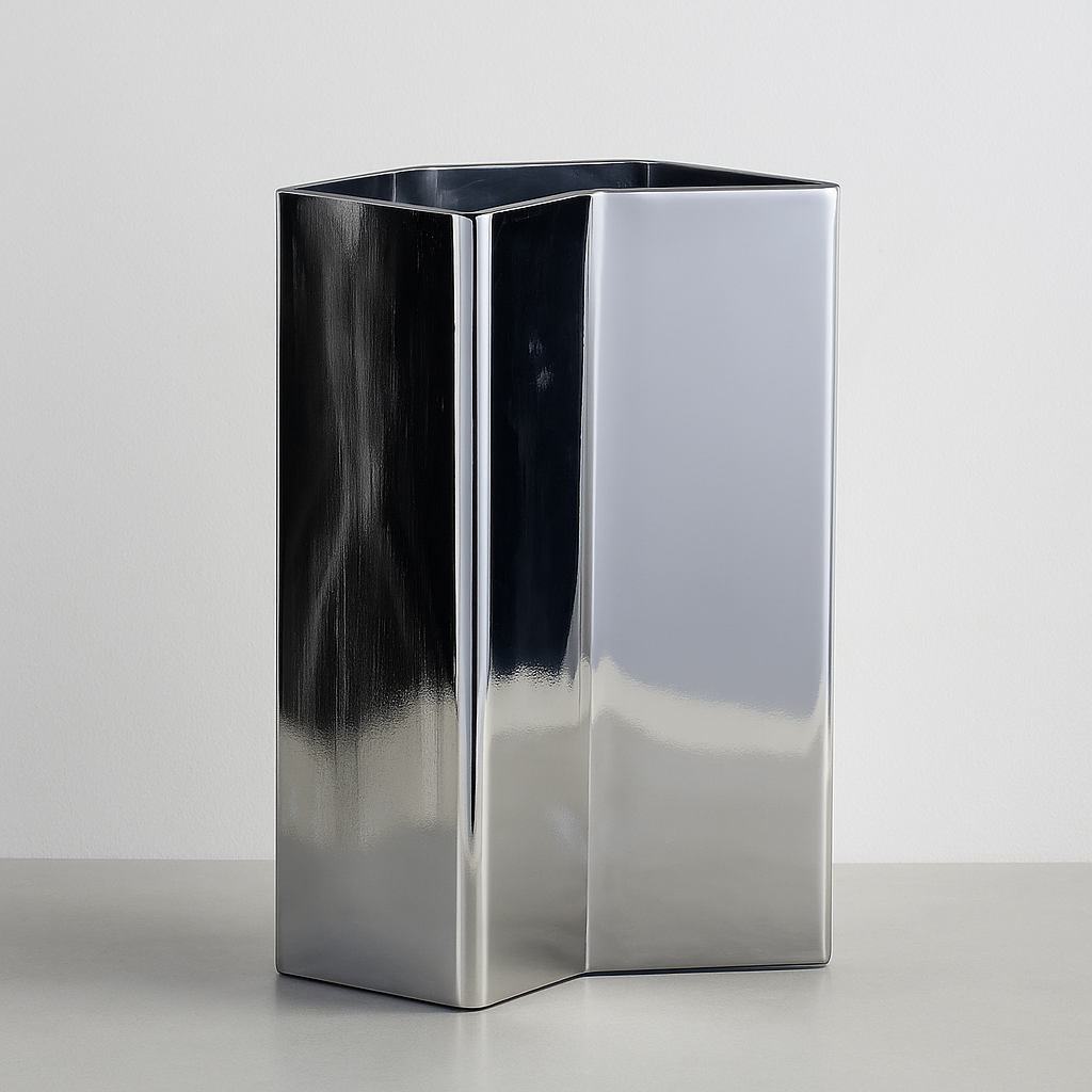 Il est fabriqué en métal avec une finition effet miroir très brillante, qui reflète élégamment la lumière et l’environnement autour de lui. Ses parois lisses et réfléchissantes lui confèrent un style contemporain et sophistiqué, idéal pour un intérieur design.