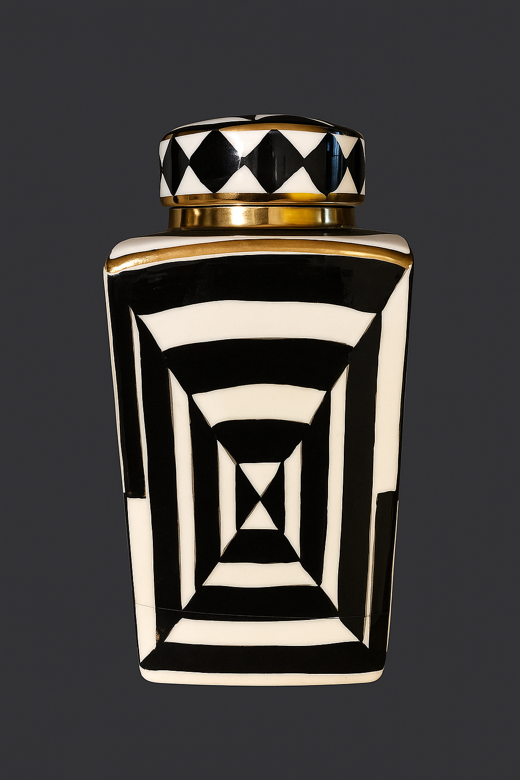 Couvercle : orné d’un bandeau décoratif à motifs losangés noirs et blancs, mis en valeur par un anneau doré qui apporte une touche élégante et luxueuse.