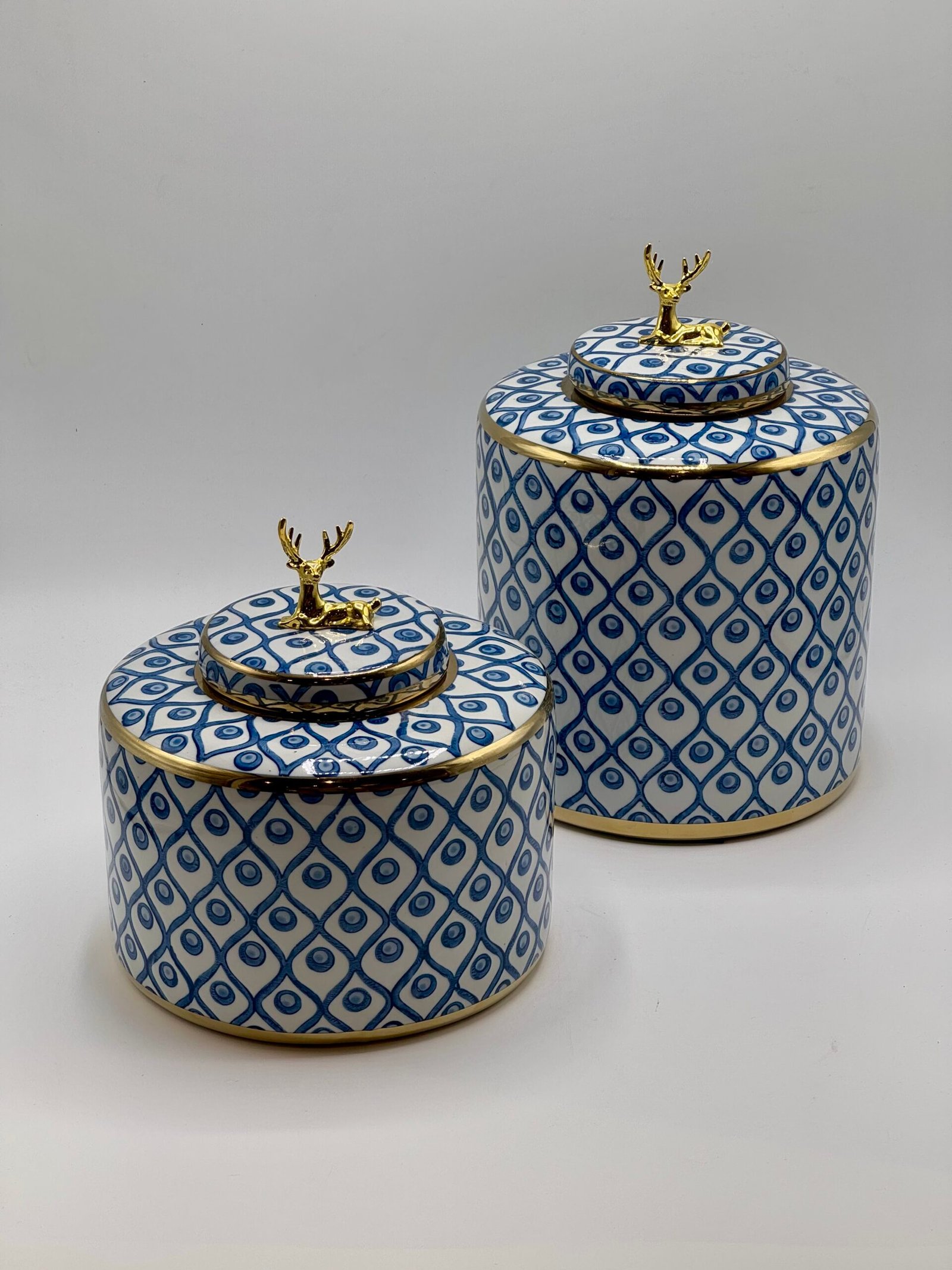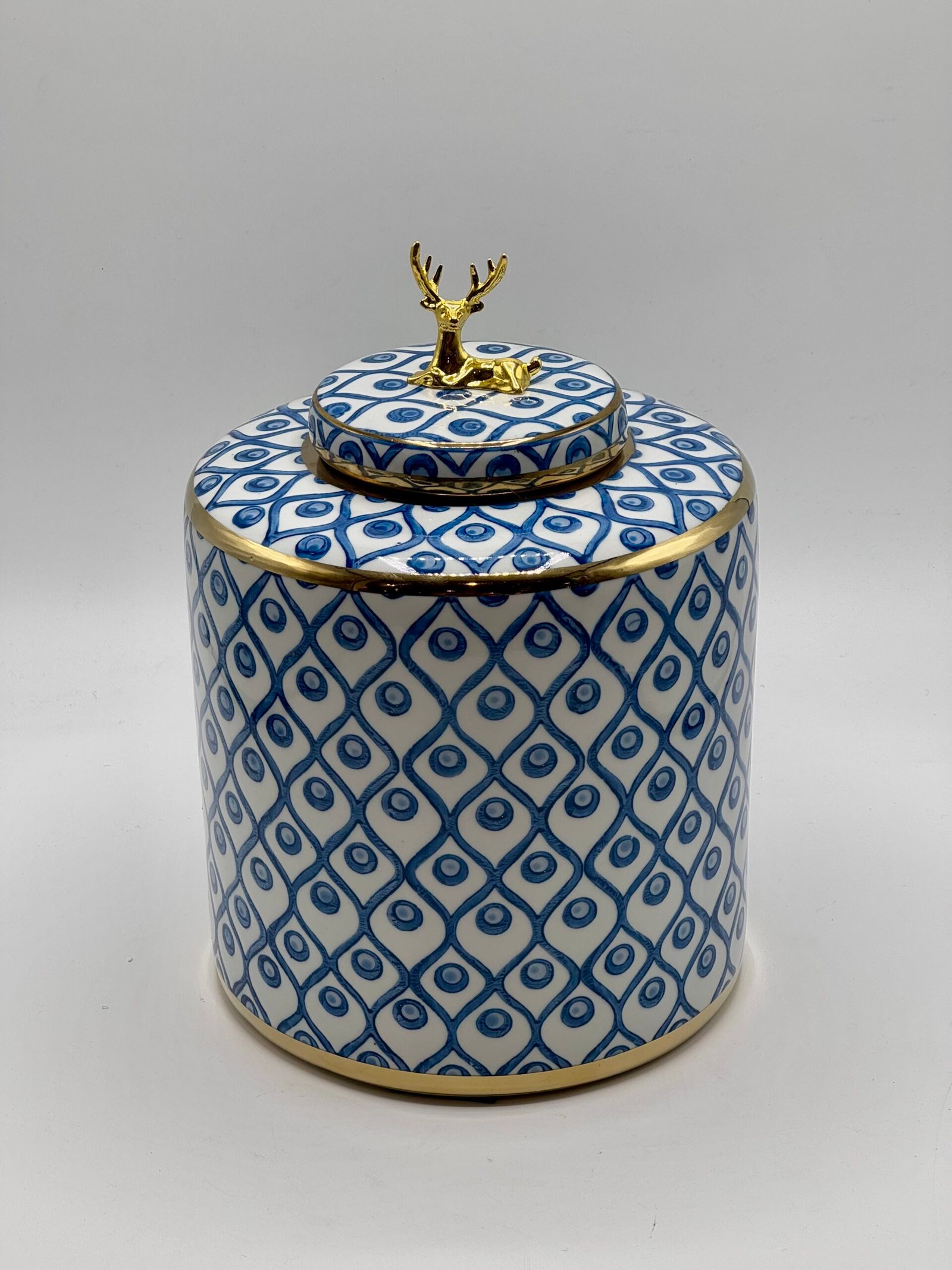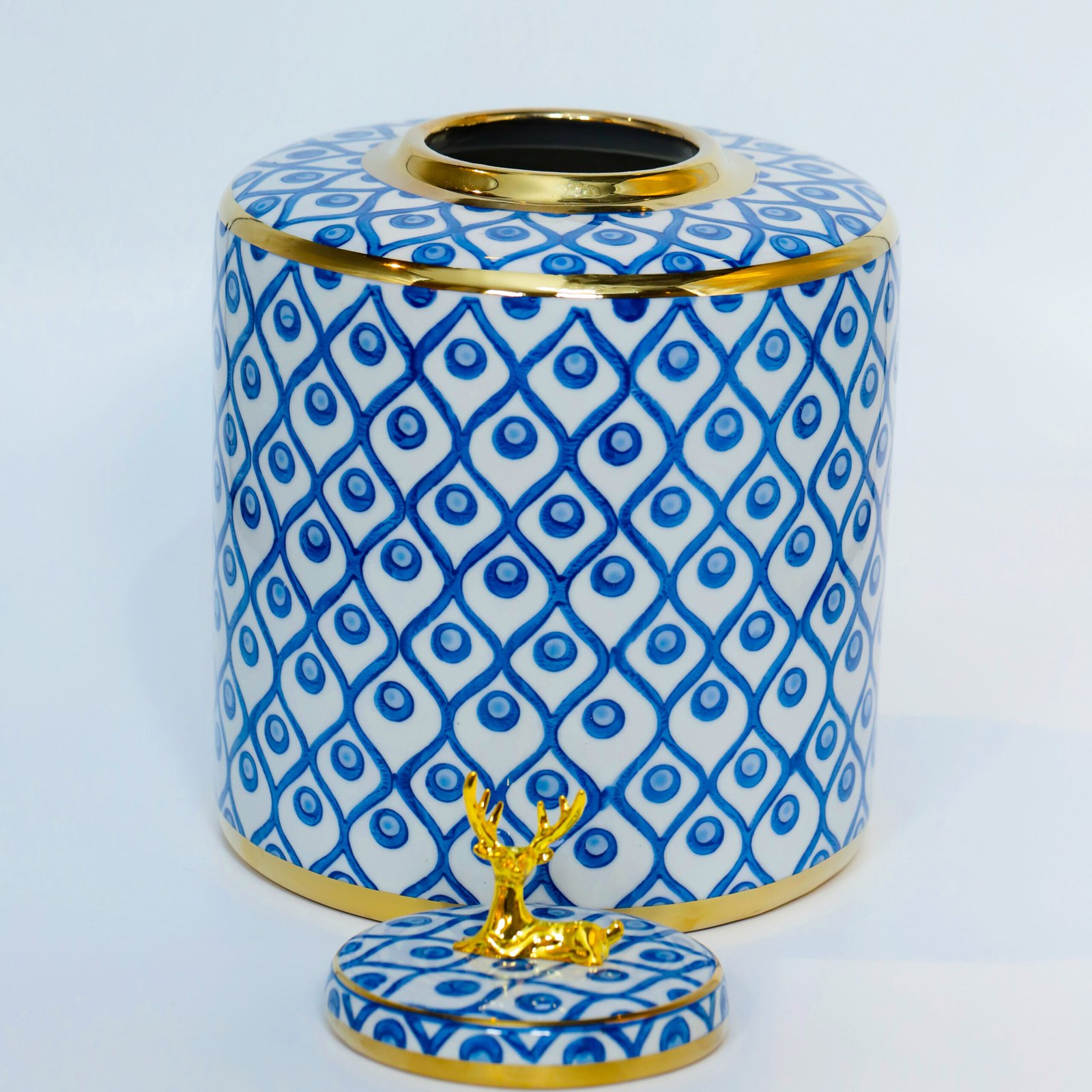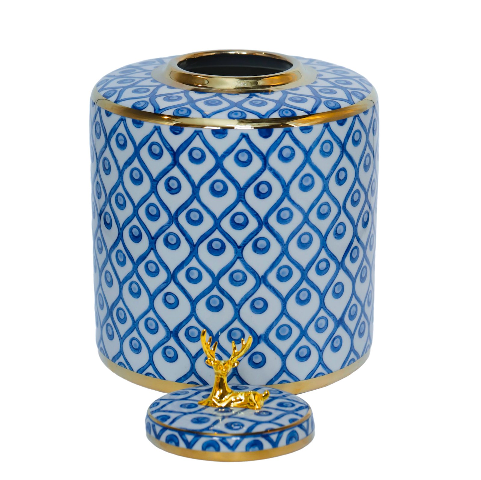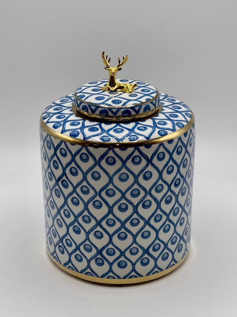 Ce vase grand modèle en céramique se distingue par sa silhouette cylindrique haute et droite, sublimée par un couvercle plat orné d’une élégante figurine dorée représentant un cerf allongé. L’ensemble du vase est habillé d’un motif géométrique en losanges bleus contenant chacun un cercle central, créant un effet visuel rythmé et raffiné.