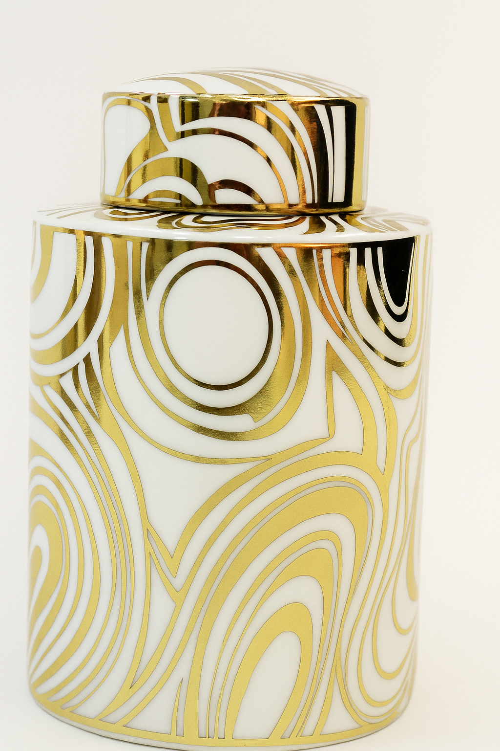 Vase en céramique blanche assorti, avec les mêmes motifs dorés raffinés. Plus compact et trapu, il est parfait pour être exposé seul sur une table ou associé au modèle grand pour créer un ensemble harmonieux et élégant.