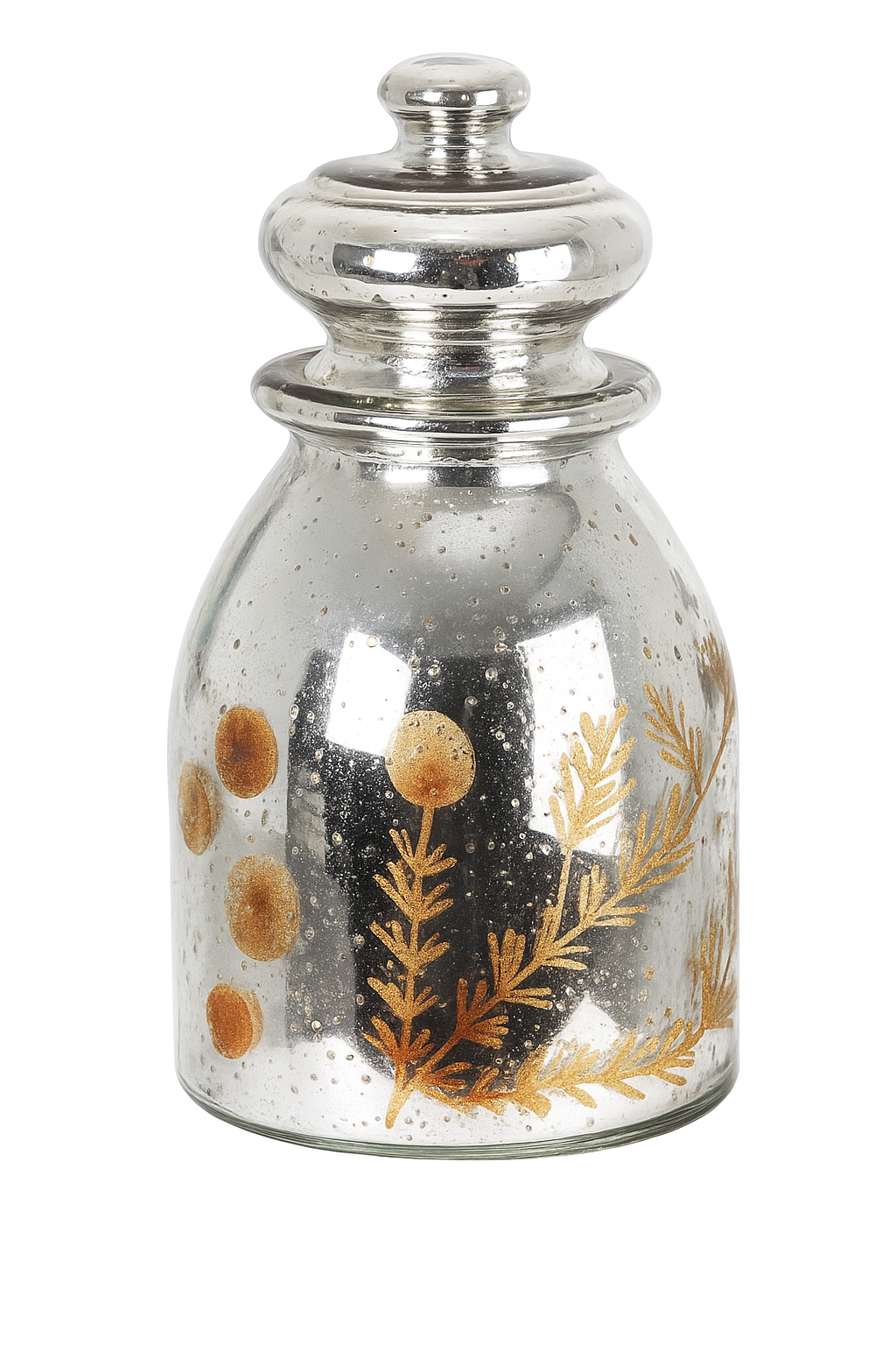Ce vase en céramique présente une allure élégante et intemporelle. Il est réalisé dans un verre ou une céramique à effet miroir argenté, lui donnant une finition brillante et légèrement vieillie, semblable au verre mercuré. Sa forme est arrondie à la base, s’élevant vers un col étroit et un couvercle bombé finement travaillé, rappelant les bocaux anciens.