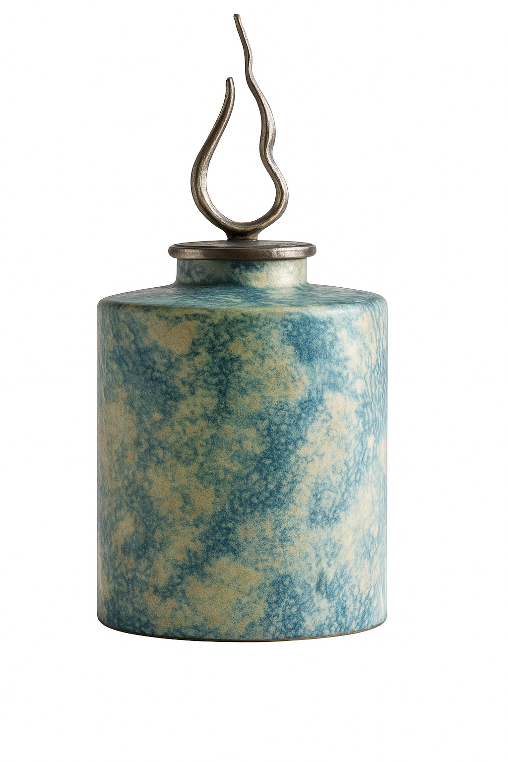 Le couvercle est surmonté d’un ornement métallique sculpté en forme de flamme stylisée, apportant une touche artistique et contemporaine au design.