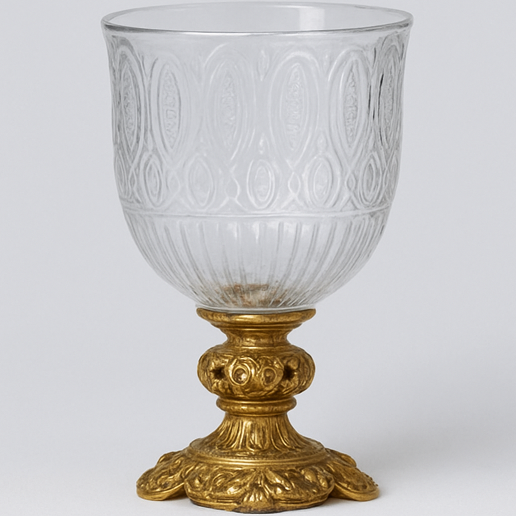 La partie inférieure en cristal est finement cannelée, accentuant la transparence et la brillance du matériau. Le vase repose sur un socle en métal doré sculpté, orné de motifs floraux et de volutes baroques. Ce contraste entre la clarté du cristal et l’éclat doré du pied donne à l’ensemble un aspect raffiné et luxueux, rappelant les pièces décoratives d’époque ou de style classique.