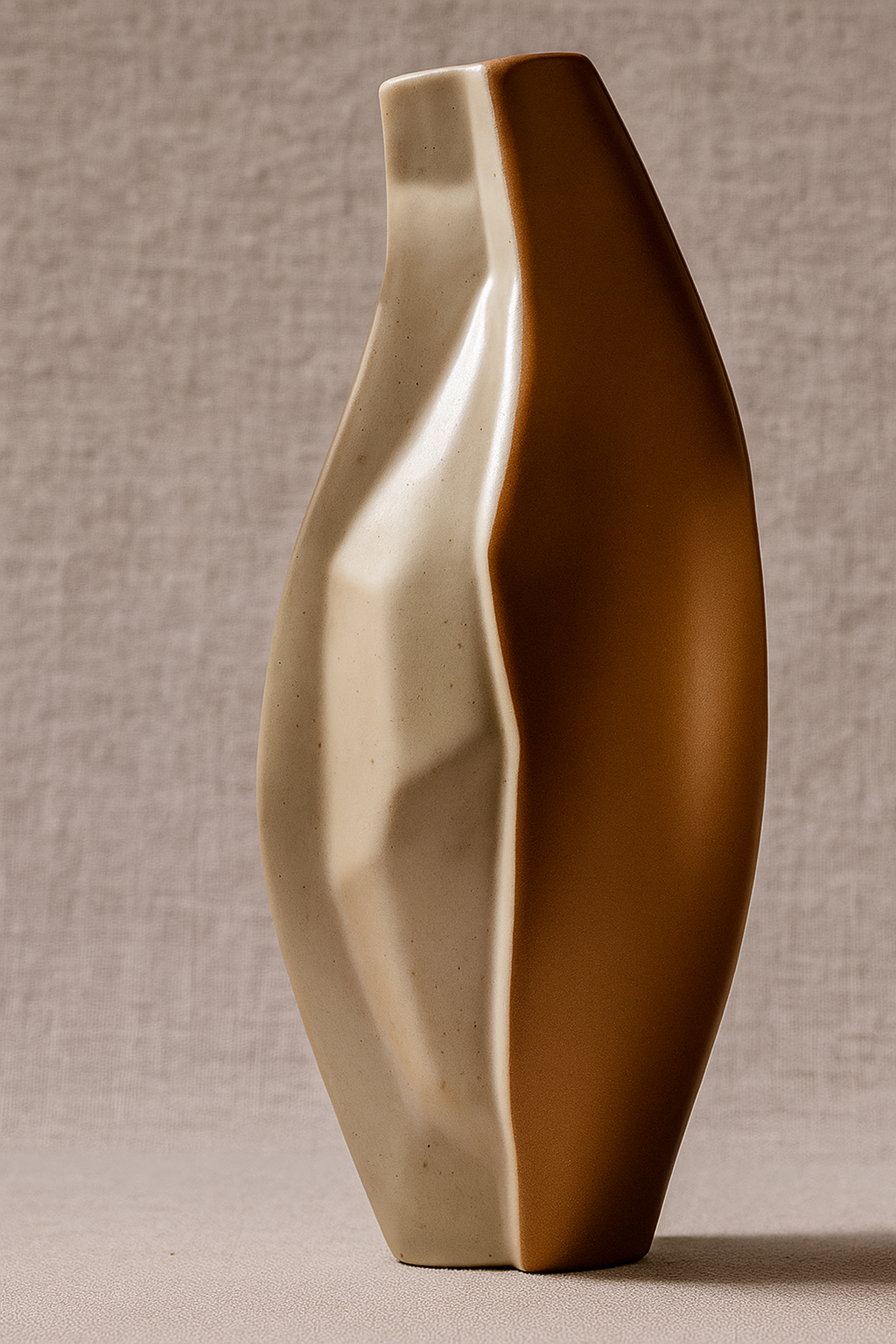 Ce vase présente une forme moderne et sculpturale, avec des lignes géométriques douces et un design asymétrique. Il est réalisé en métal, avec une finition bicolore : une moitié arbore une teinte beige claire satinée, tandis que l’autre moitié est recouverte d’une couleur bronze cuivré. La surface lisse et légèrement brillante capte la lumière, mettant en valeur ses courbes et arêtes anguleuses. Ce vase dégage une allure contemporaine et élégante, parfaite pour une décoration minimaliste ou design.