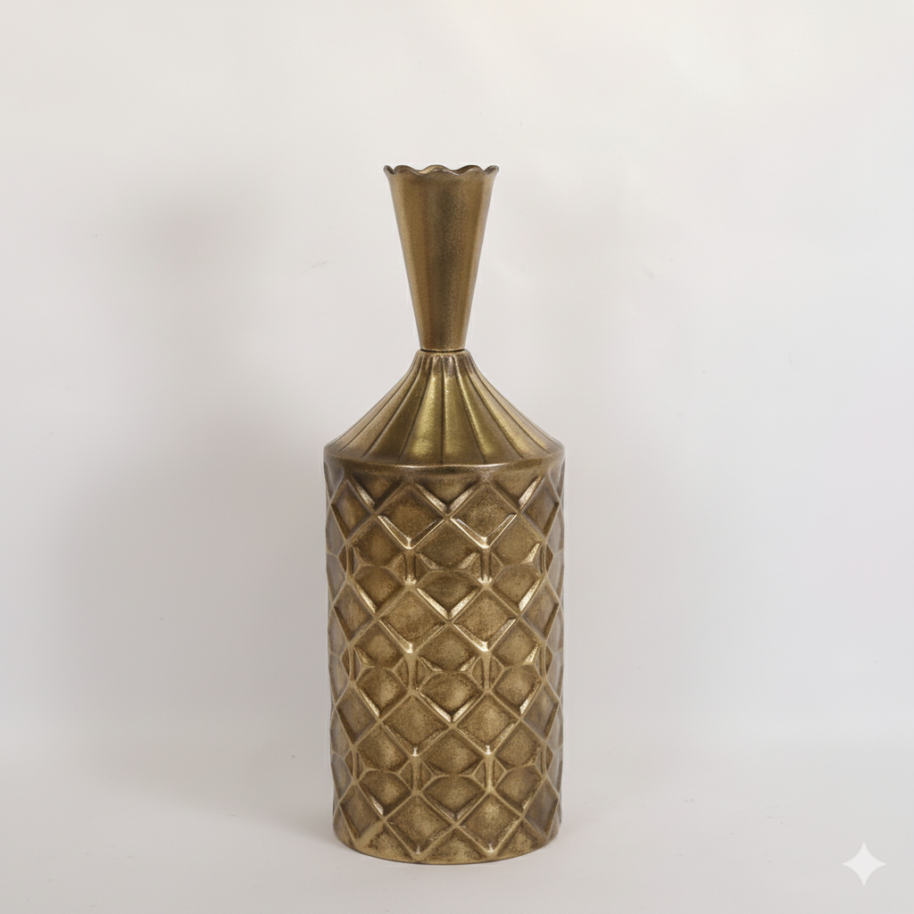 Ce vase en métal, version petit modèle, reprend la même silhouette élancée et élégante que le grand format. Sa base cylindrique est ornée d’un motif en losanges en relief, avec une finition bronze ou doré vieilli qui lui confère charme et caractère. Plus compact et discret, il est idéal comme élément décoratif sur une étagère, une console ou en centre de table. Sa partie supérieure lisse et son col légèrement évasé à bord ondulé ajoutent une touche sophistiquée, même dans ce format réduit.