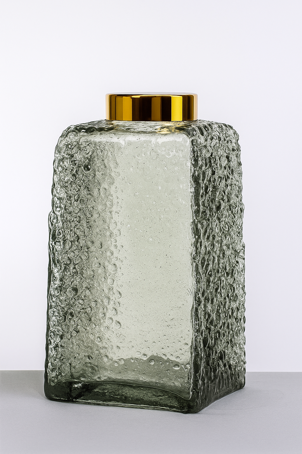 La transparence du verre laisse passer la lumière de manière subtile, créant un bel effet visuel. Le couvercle doré métallisé vient ajouter une touche de luxe et de contraste, rehaussant le caractère raffiné de la pièce.