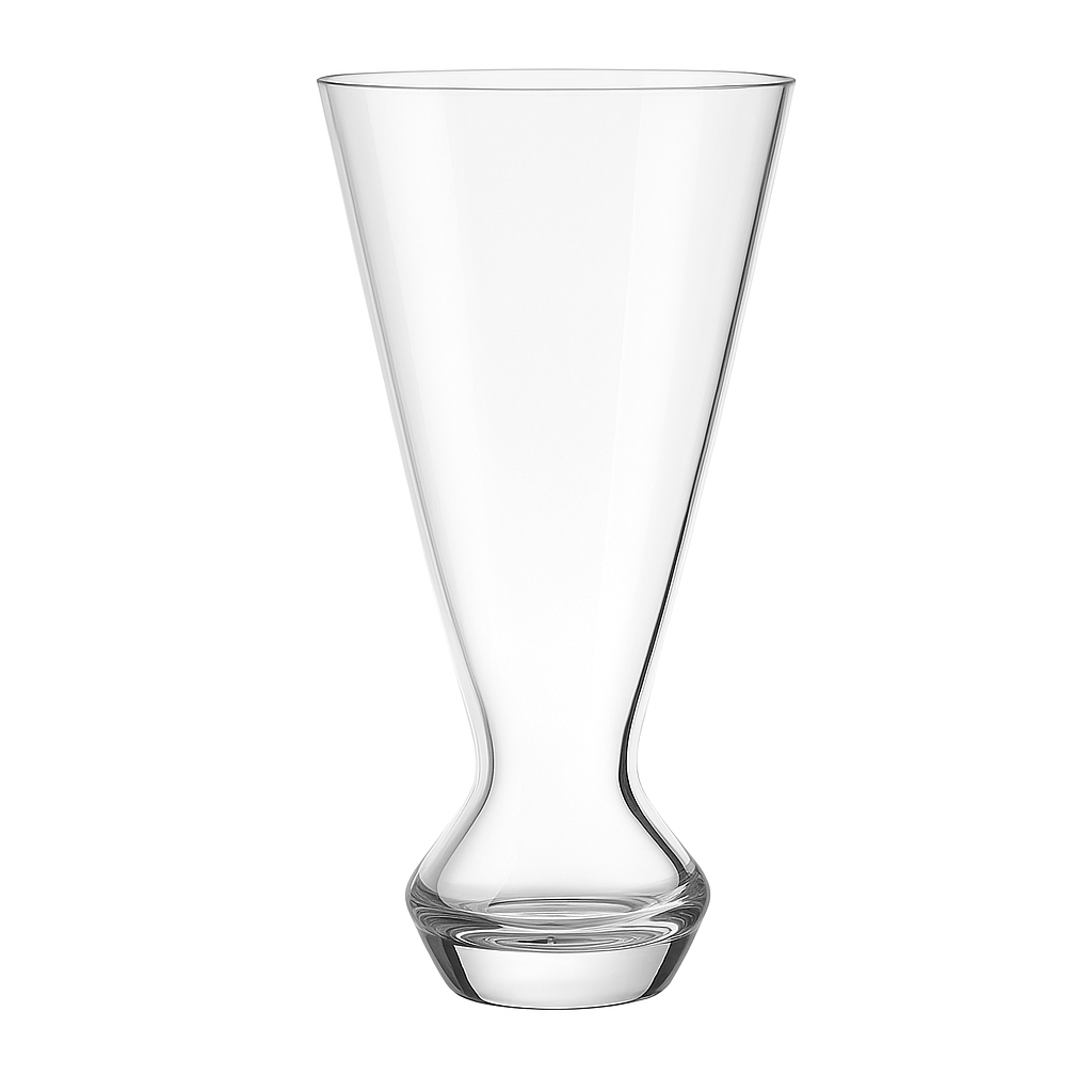 Ce vase en verre transparent présente une forme moderne et raffinée. Il s’élargit progressivement vers le haut, formant une silhouette en cône inversé, tandis que la base, plus épaisse et arrondie, assure une stabilité visuelle et physique.