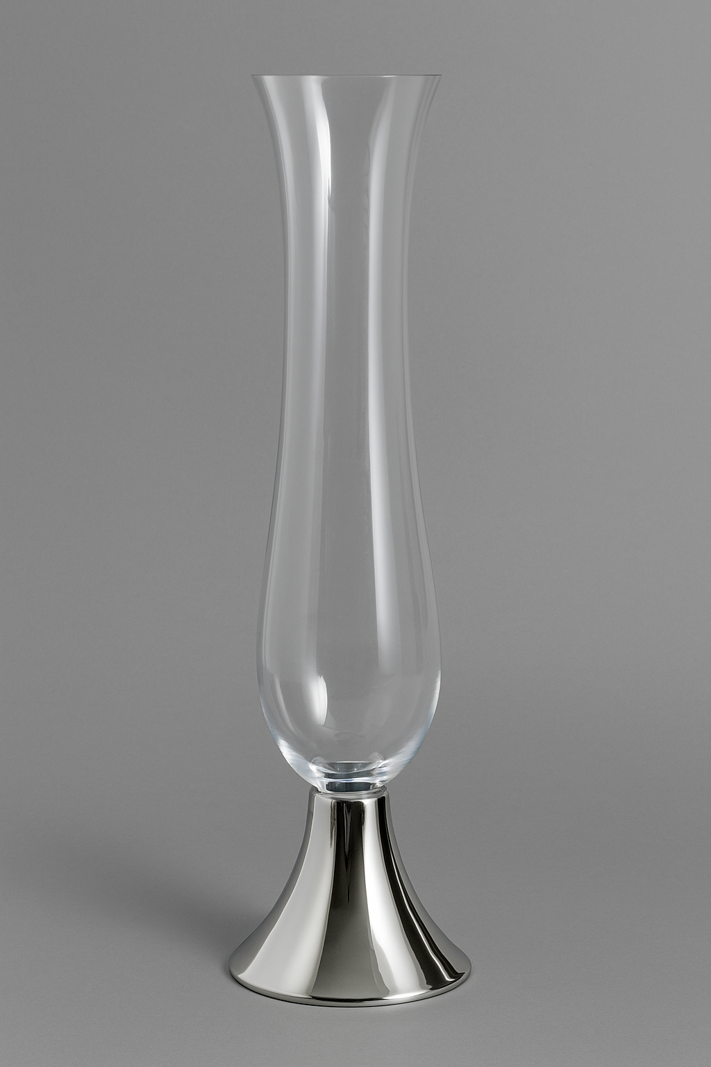 La base, en métal chromé brillant, apporte une touche moderne et luxueuse tout en assurant une excellente stabilité. L’association du verre clair et du métal poli crée un contraste élégant, idéal pour une décoration contemporaine ou minimaliste.