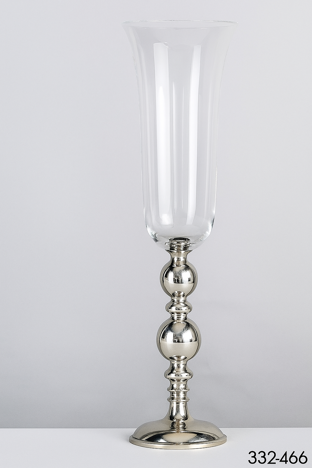 Le pied du vase, en métal argenté poli, se distingue par un design travaillé composé de formes sphériques empilées, évoquant un style classique et élégant. La base circulaire assure une bonne stabilité tout en reflétant la lumière, ce qui renforce l’aspect luxueux de l’ensemble.
