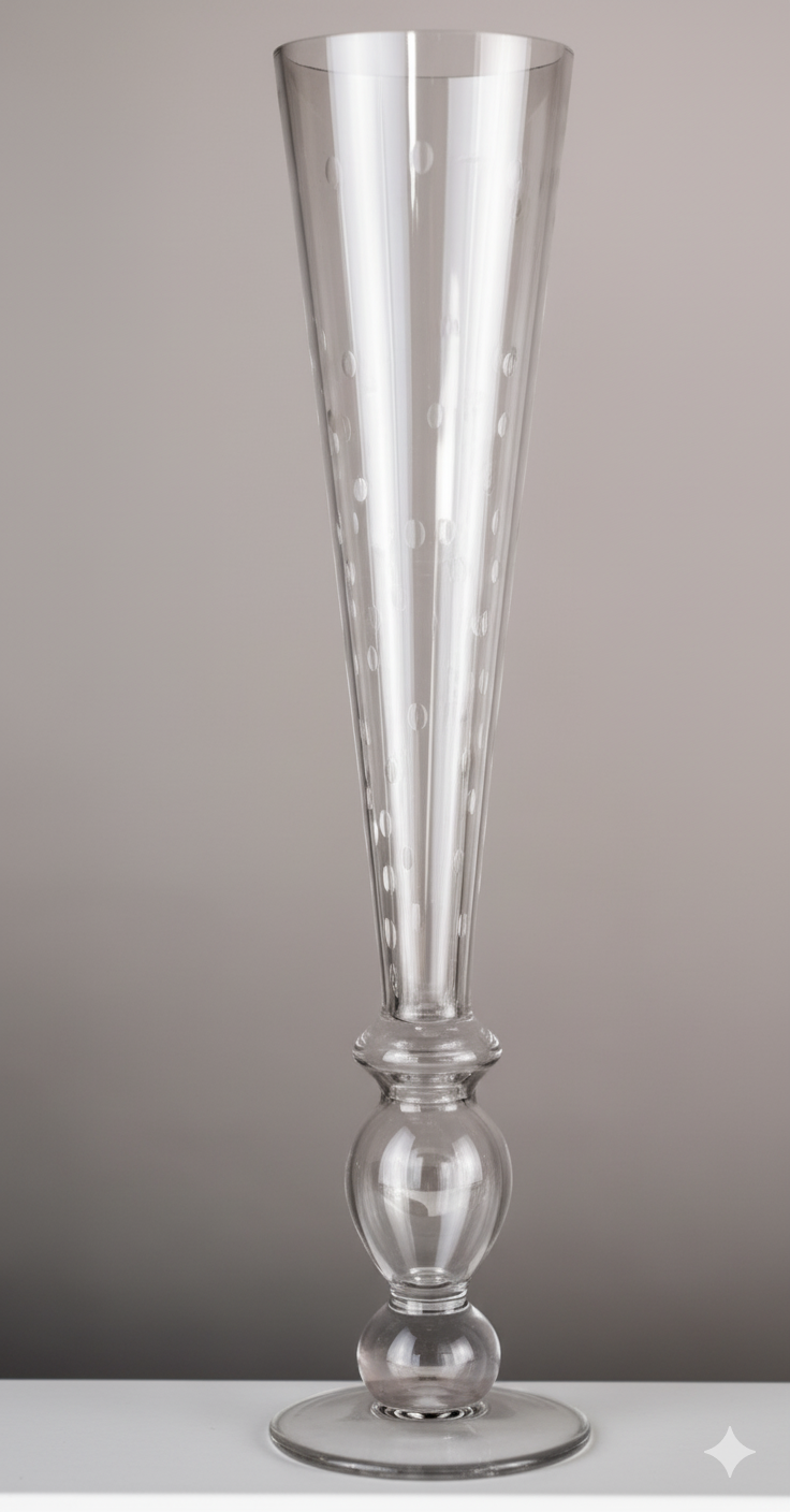 Le vase repose sur un pied sculpté et raffiné, composé de formes sphériques et annulaires superposées qui s’affinent jusqu’à une base large et stable. Ce travail du verre témoigne d’un savoir-faire artisanal et confère à la pièce une présence visuelle raffinée.