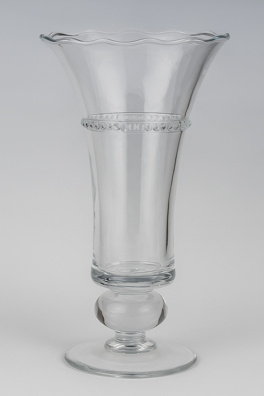 Ce vase petit modèle, façonné en cristal transparent, séduit par son allure majestueuse et son éclat raffiné. Sa forme évasée vers le haut se prolonge jusqu’à un large col aux bords ondulés, apportant une touche de délicatesse et de mouvement à l’ensemble.