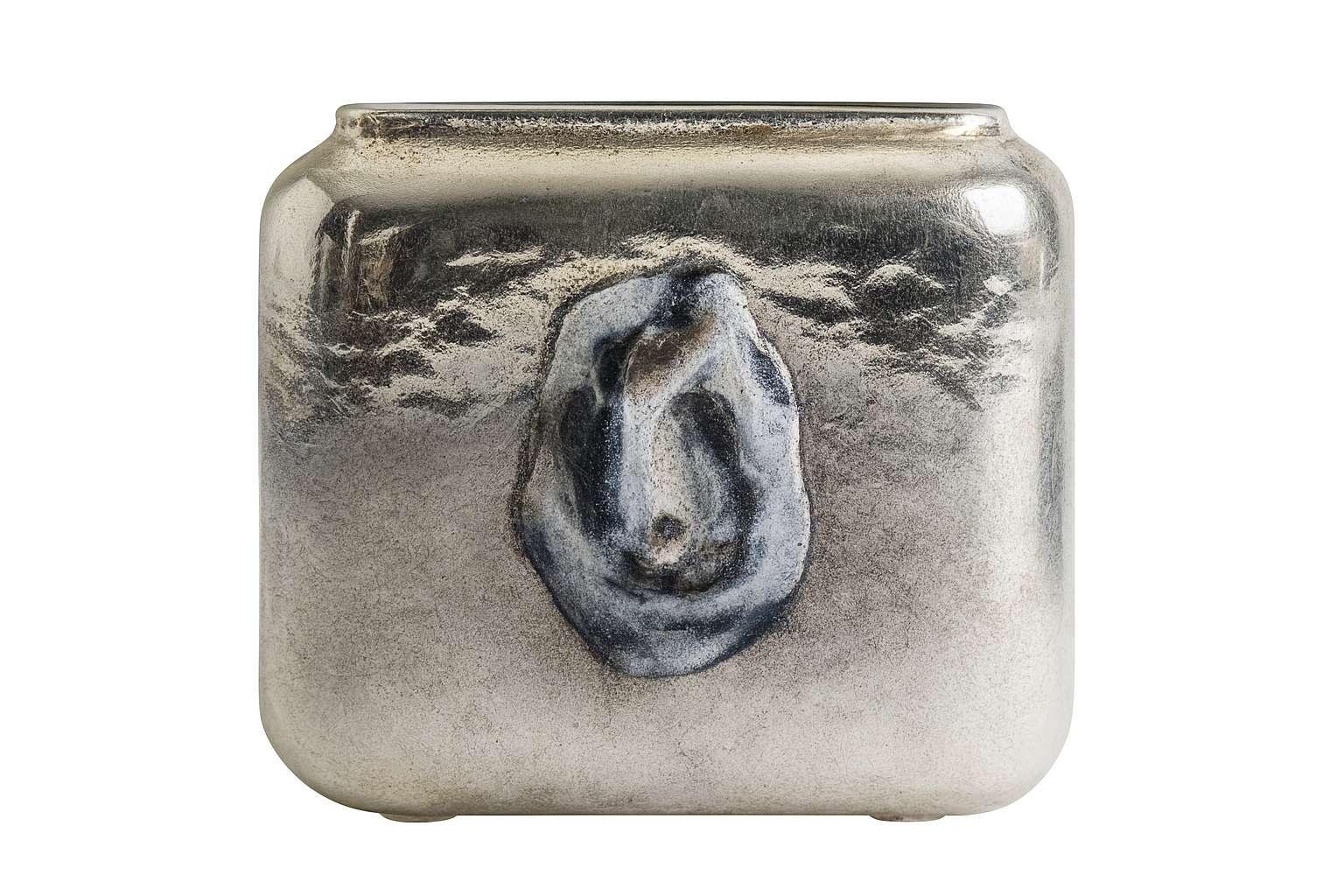 Ce vase présente une forme carrée aux angles arrondis, avec une surface métallique argentée à l’aspect légèrement vieilli ou patiné.