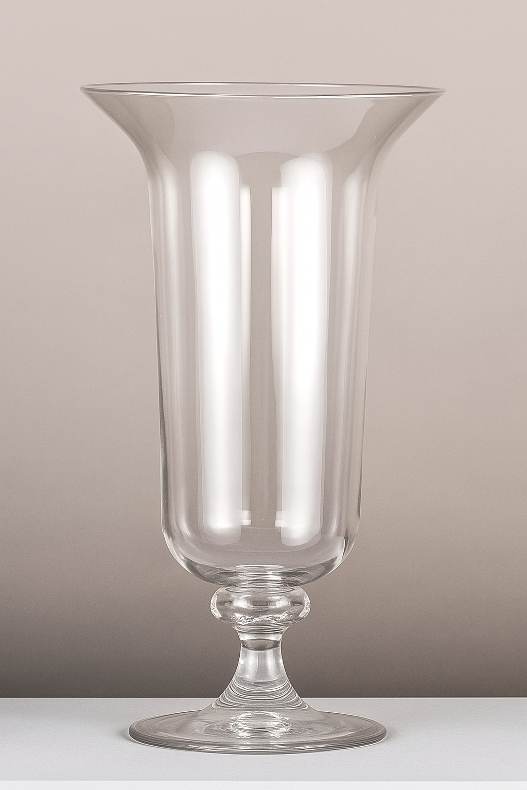 Le col s’évase subtilement vers l’extérieur en une élégante ouverture en trompette, bordée d’un rebord net et poli. L’absence d’ornement souligne la pureté du design et met en valeur la transparence cristalline du matériau.