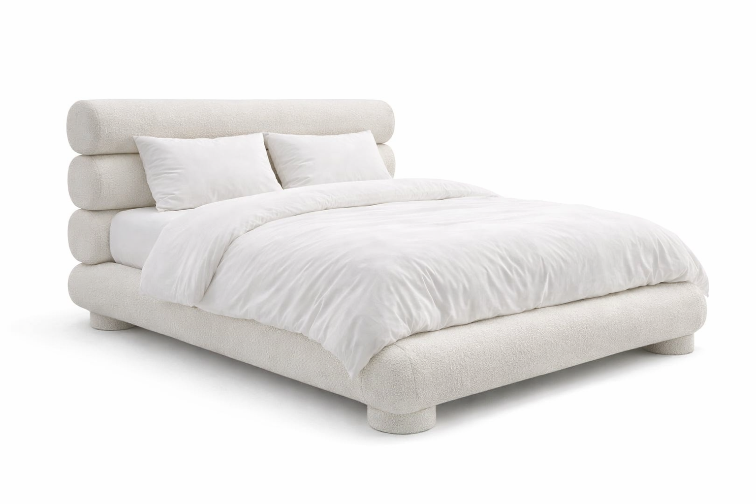 Sa structure est entièrement rembourrée avec un tissu texturé de haute qualité, offrant un toucher chaleureux et un rendu visuel très raffiné. La particularité de ce modèle réside dans sa tête de lit composée de cylindres superposés, formant un dossier original, confortable et très décoratif, qui donne au lit une identité forte et luxueuse.